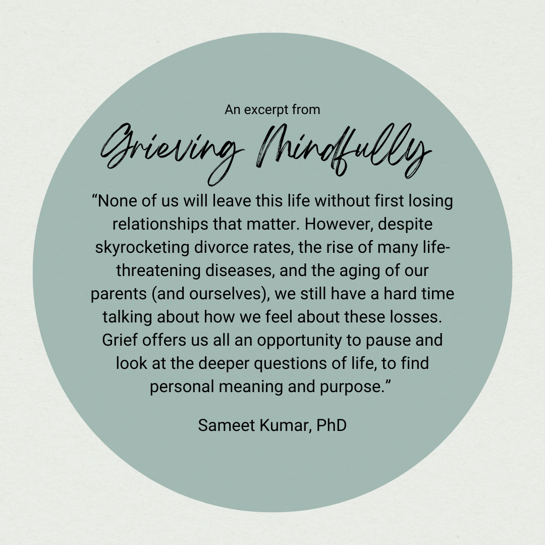 “Loss is a part of everyone’s life. We suffer loss in many ways: separation, divorce, unemployment, relocation, immigration, natural disaster, illness, and death. None of us will leave this life without first losing relationships that matter. However, despite skyrocketing divorce rates, the rise of many life-threatening diseases, and the aging of our parents (and ourselves), we still have a hard time talking about how we feel about these losses. Grief offers us all an opportunity to pause and look at the deeper questions of life, to find personal meaning and purpose.” – Sameet Kumar, PhD